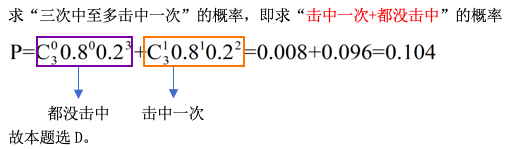 某人射击三次,其命中率为0.8,则三次中至多命中一次的概率为( ) 作者:高老师 时间:2024-07-28 浏览 3 某人射击三次,其命中率为0.8,则三次中至多命中一次的概率为( )A、0.002B、0.04C、0.08D、0.104【正确答案】:D【题目解析】: 📱 扫码体验刷题小程序 扫一扫使用我们的微信小程序