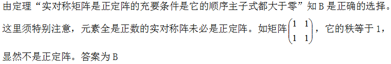 作者:高老师 时间:2024-07-29 浏览 1 A、实对称且主对角线上元素为正B、实对称且顺序主子式值都为正数C、实对称且所有元素为正D、实对称且行列式值为正数【正确答案】:B【题目解析】: 📱 扫码体验刷题小程序 扫一扫使用我们的微信小程序