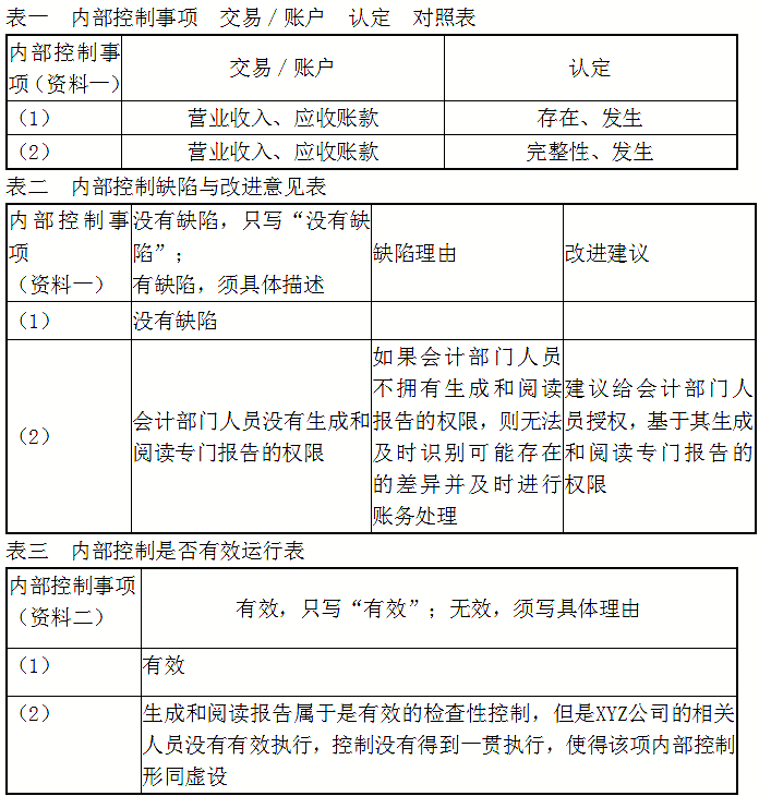 (3)针对资料二(1)至(2)项,假定不考虑其他条件,请逐项指出上述测试结果是否表明相关内部控制得到有效执行。如果表明相关内部控制未能得到有效执行,请简要说明理由。请将答案直接填入表三。