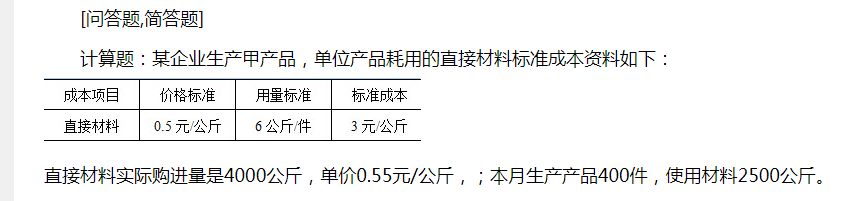 【正确答案】:(1)生产用直接材料的实际成本=2 500X0. 55=1 375(元)直接材料的标准成本= 400X3 = 1 200(元)直接材料成本总差异=1 375 - 1 200 =175(元)(2)直接材料价格差异=2 500X (0. 55 - 0. 5) =125(元)直接材料数量差异=(2 500 - 400X6) X0. 5 =50(元)直接材料成本差异=125 + 50=175(元)