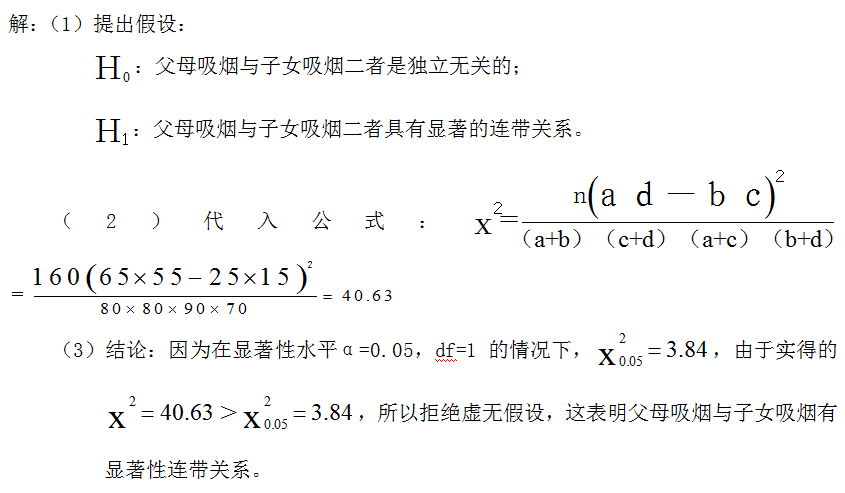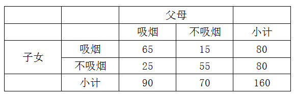 为了研究父母吸烟对子女吸烟是否有显著性影响,随机调查了160名青少年及其家长,数据如下表所示,试问:子女吸烟与父母吸烟之间是否存 作者:高老师 时间:2025-02-15 浏览 4 为了研究父母吸烟对子女吸烟是否有显著性影响,随机调查了160名青少年及其家长,数据如下表所示,试问:子女吸烟与父母吸烟之间是否存在某种联系?(df=l,=3.84,结果保留到小数点后两位数)【正确答案】: 📱 扫码体验刷题小程序 扫一扫使用我们的微信小程序
