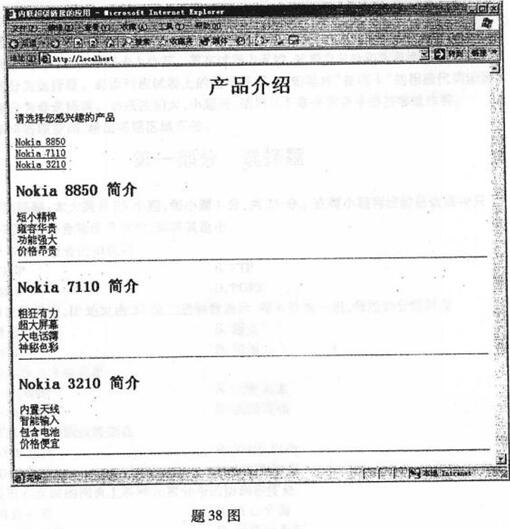 按要求编写HTML程序,实现如图38所示功能。 要求: ①网页主题为“内联超级链接的应用”; ② 页面内容“产品介绍”居中显示; ③ 建立三个内联标记,标记名分别为:##7110和#3210,内容分别为:No- kiaNokia7110和Nokia3210,当鼠标分别单击这三个标识内容时,网页将分别跳转到Nokia8850简介、Nokia7110简介和Nokia3210简介处并查看每种产品的详细介绍; ④ 其他信息如图38所示。