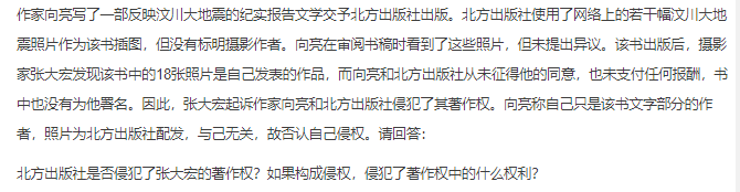 作者:高老师 时间:2024-08-08 浏览 1 【正确答案】:北方出版社侵犯了张大宏的著作权。侵犯的是张大宏对其摄影作品的人身权和财产权,其中的人身权是署名权,财产权是复制权和发行权。 📱 扫码体验刷题小程序 扫一扫使用我们的微信小程序
