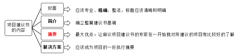 摘要最大的优点是能让审议建议书的专家在一开始就对所建议的项目有一个比较好的了解,可以在项目建议书的开始页或封面页上